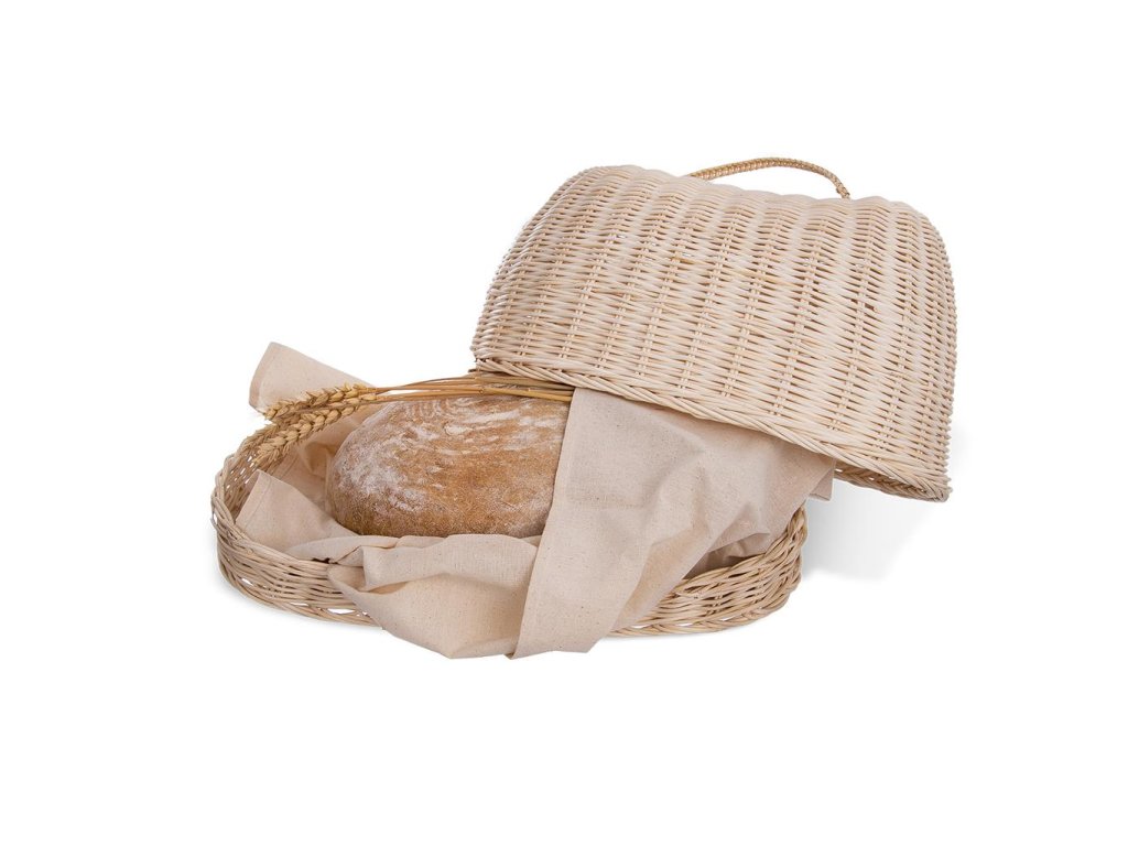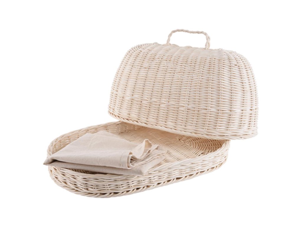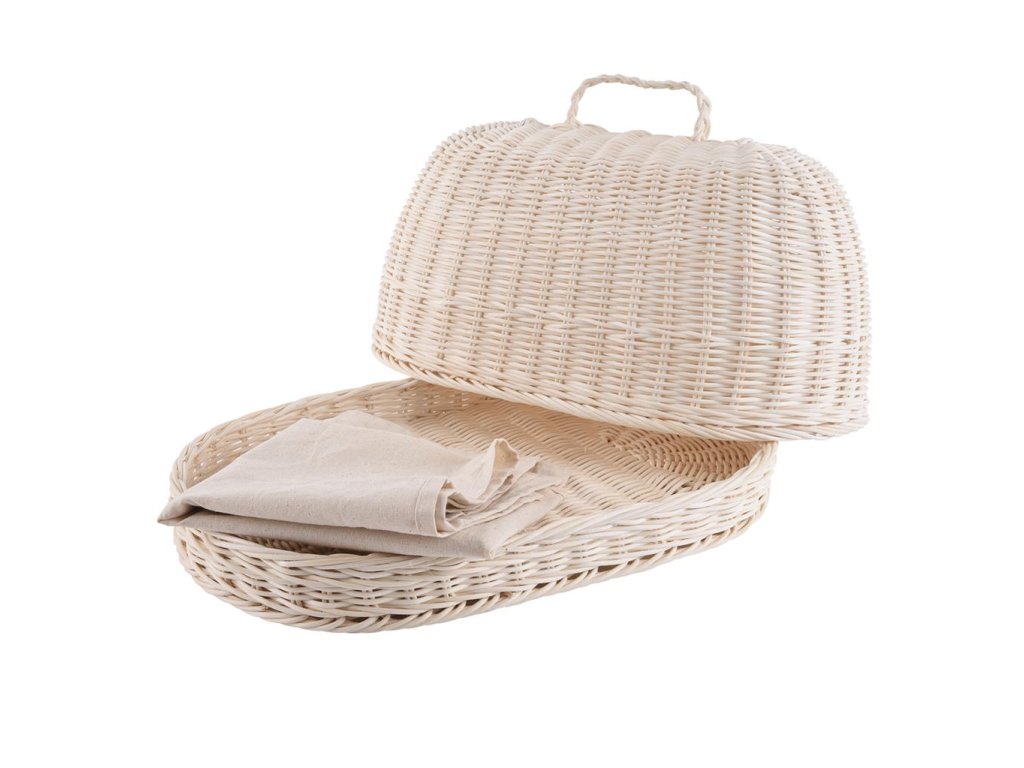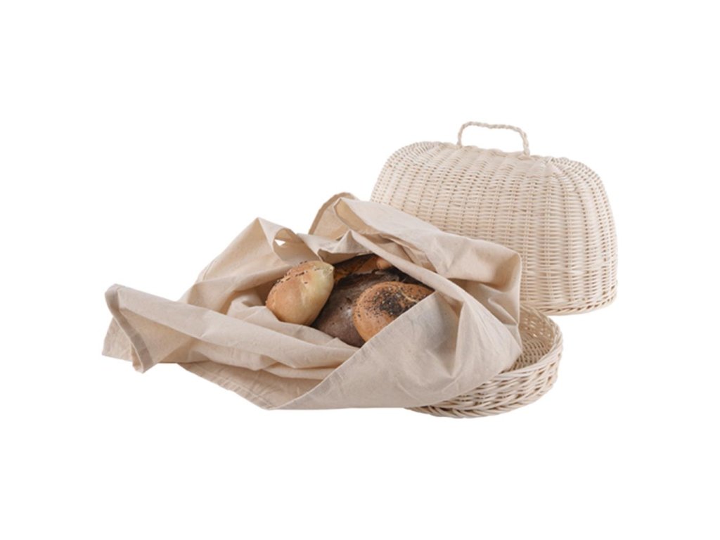Chlebník z pleteného ratanu splní funkciu uskladnenia chleba či pekárneských výrobkov, aby zostali vždy čerstvé a neosychali. Zároveň budú chránené pred hmyzom či nečistotami. Doplnok do domácnosti, ktorý nikdy nebude nadbytočný. Plní i funkciu podnosu na servírovanie - jednoducho odklopte veko a podávajte. Súčasťou chlebníka je textilná utierka na zabalenie pečiva. Chlebník sa ednoducho sa čistí, jemne ho pretrite vlhkou handričkou alebo použite jemnú kefku. Utierku možno prať v práčke. Materiál: ratan, bavlna. Rozmery: 40x25x22 cm, utierka 70x70 cm.