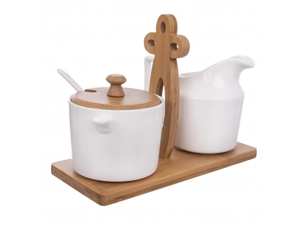 Sada mliekovky a cukorničky v drevenom bambusovom stojane zaujme na prvý pohľad. Vďaka svojmu vzhľadu bude ozdobou každej klasickej i modernej kuchyne. Praktický pomocník pri servírovaní kávového či čajového pohostenia. Materiál: porcelán, bambusové drevo. Rozmery: mliekovka objem 0,28 l, 7x10 cm, cukornička objem 0,28 l, 8x9 cm, stojan 20,5x9x15 cm.Dodatočné parametre