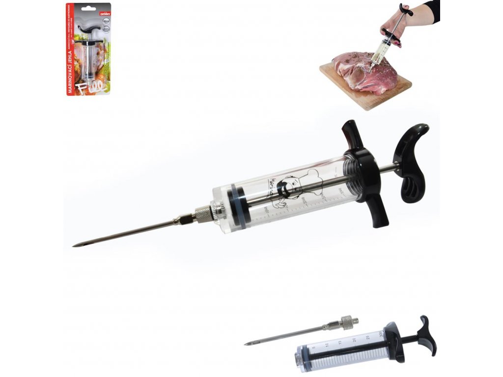 Dávkovač injekčný, plastový s piestom je skvelým pomocníkom pri príprave mäsa. Do veľkých kusov pohodlne pomocou dávkovača vstrekneme pripravenú marinádu, alebo olej. Mäso po upečení tak bude chutné a voňavé. Marinovanie sa tak stáva zábavou a nezaberie veľa času. Striekačka sa dá využiť aj na plnenie šišiek marmeládou. Materiál: plast, ihla – kov. Rozmer: zásobník – objem 0,03 l, dĺžka 14 cm, priemer 2,5 cm, dĺžka ihly 8 cm.Dodatočné parametre