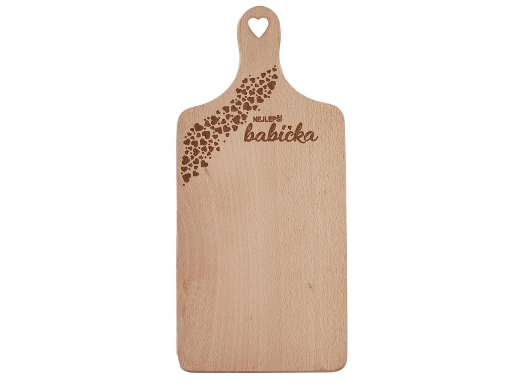 Rustikálna doska - lopárik na krájanie či servírovanie. S praktickou rukoväťou a s vypaľovaným dekorom NEJLEPŠÍ babička. Pohodlne a štýlovo na nej naservírujete raňajky i večere. Využiteľná je pri kuchynských činnostiach ako krájanie, či príprava na grilovanie. Výnimočne jednoduchá údržba, stačí pretrieť vlhkou handričkou a doska je opäť pripravená na používanie. Materiál: drevo. Rozmery: 30x14 cm.Dodatočné parametre
