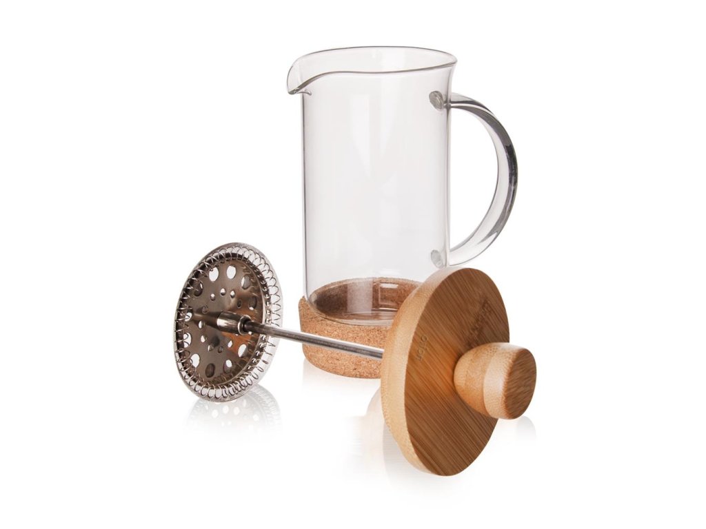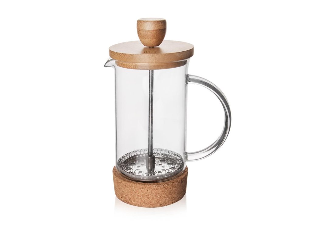 Pripraviť si voňavú šálku kávy či obľúbeného čaju sa pomocou kanvice so sitkom a piestom stane hračkou. Jednoducho si dokážete pripraviť chutný nápoj bez usadeniny či plávajúcich lístkov. Jemné sitko na princípe piestu zatlačí pevné súčasti na dno nádoby a vám zostane čistý čaj alebo káva. Je len na vás, či kafetier použijete na prípravu horúcich alebo studených nápojov. Tip: vyskúšajte zaliať zmes drobného ovocia v sklenom pohári vlažným čajom, prípadne doplňte kockami ľadu. Jednoduché čistenie. Stabilná počas manipulácie vďaka korku. Materiál: borosilikátové sklo (odolné teplotám do 180 ° C, ale nie je varné sklo!), nerez, bambus, korok. Nie je vhodná do umývačky riadu kvôli častiam z lepeného korku. Rozmery: objem 0,4 l, priemer 7 cm, výška 14/17 cm.Dodatočné parametre
