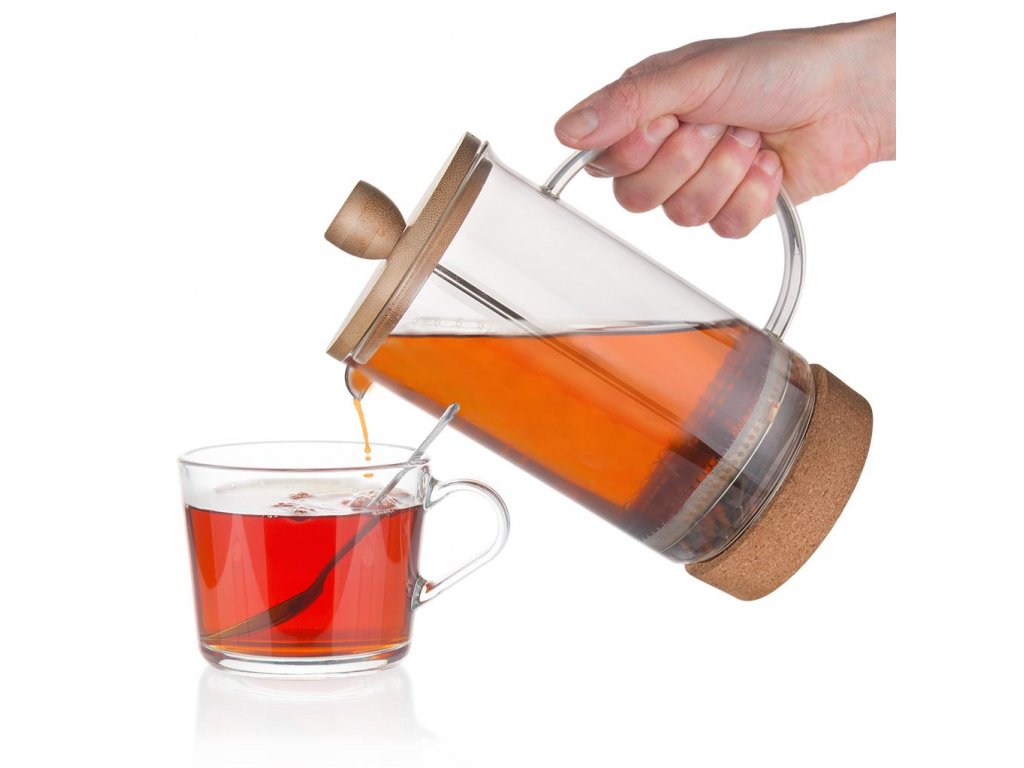 Pripraviť si voňavú šálku kávy či obľúbeného čaju sa pomocou kanvice so sitkom a piestom stane hračkou. Jednoducho si dokážete pripraviť chutný nápoj bez usadeniny či plávajúcich lístkov. Jemné sitko na princípe piestu zatlačí pevné súčasti na dno nádoby a vám zostane čistý čaj alebo káva. Je len na vás, či kafetier použijete na prípravu horúcich alebo studených nápojov. Tip: vyskúšajte zaliať zmes drobného ovocia v sklenom pohári vlažným čajom, prípadne doplňte kockami ľadu. Jednoduché čistenie. Stabilná počas manipulácie vďaka korku. Materiál: borosilikátové sklo (odolné teplotám do 180 ° C, ale nie je varné sklo!), nerez, bambus, korok. Nie je vhodná do umývačky riadu kvôli častiam z lepeného korku. Rozmery: objem 1 l, priemer 10 cm, výška 18/21 cmDodatočné parametre