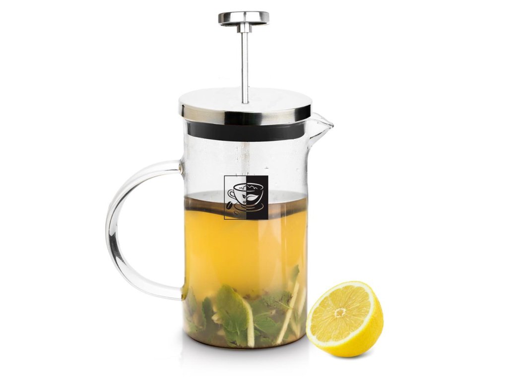 Ak si ani vy neviete predstaviť deň bez voňavej šálky kávy či obľúbeného čaju, pomocou kanvice so sitkom a piestom dokážete pripraviť chutný nápoj bez usadeniny či plávajúcich lístkov. Jemné sitko na princípe piestu zatlačí pevné súčasti na dno nádoby a vám zostane čistý čaj alebo káva. Je len na vás, či kafetier použijete na prípravu horúcich alebo studených nápojov. Tip: ingrediencie na ľadovú kávu alebo napríklad kakao v nej pohodlne a rýchlo zmiešate či napeníte. Jednoduché čistenie. Materiál: sklo (odolné teplotám do 180 ° C, ale nie je varné sklo!), Plast, nerez. Rozmery: objem 1 l, priemer 9,5 cm, výška 19,5 cm.Dodatočné parametre