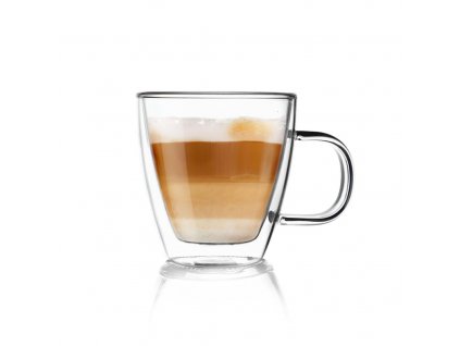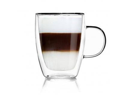 Moderný hrnček s dvojstenným sklom 0,43 l, vhodný na prípravu kávy alebo čaju.